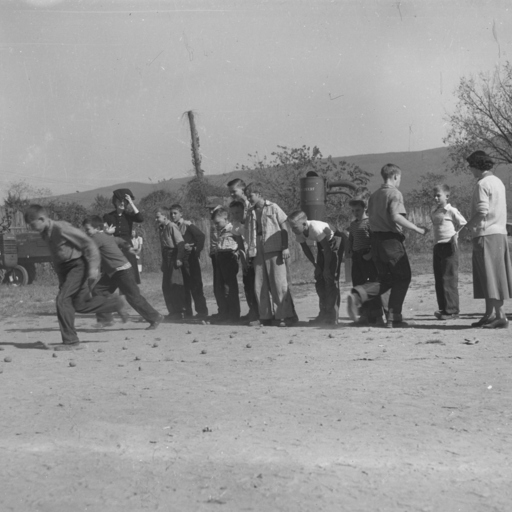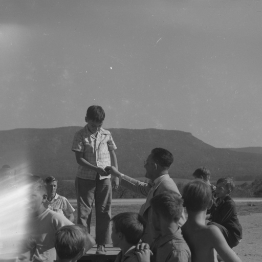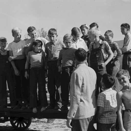 Photograph of participants at the Triplett School Fair taken on October 19-20, 1950. Triplett agriculture teacher Lawrence Bowers is visible in the background wearing glasses, coat, and tie.