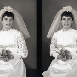 Photo of two separate photographs of Judy Mae (Strosnider) Bowers as a bride in her wedding gown, veil, and bouquet.