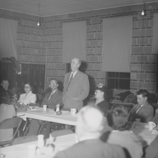 Photograph of Charles Wampler speaking at the Triplett Veterans Farm Training Banquet taken on February 22, 1951. Mr. and Mrs. Lawrence Bowers are pictured on the left and Mrs. Wampler and Marvin Sigler are pictured on the right.