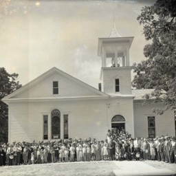 Photograph of unidentified members of the congregation of St. Luke's Brethren Church standing outdoors along the front of the building.
