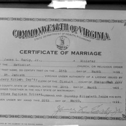 Marriage certificate attesting that Matthew Napoleon Brinker and Dorothy Elizabeth Pence were married in Mt. Jackson, Virginia, on March 28, 1944.