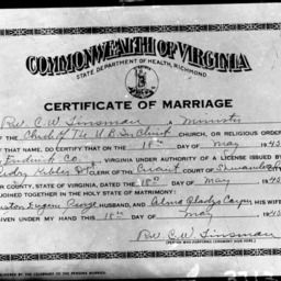 Photograph of a marriage certificate attesting that Preston Eugene George and Alma Gladys Carper were married in Frederick County, Virginia, on May 18, 1945.
