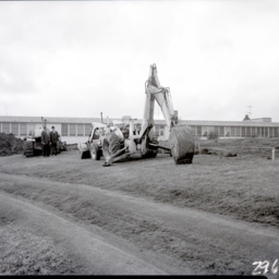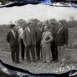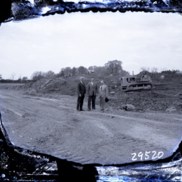 Photograph of five men working with a railroad crane to install a piece of the railroad trestle crossing Toms Brook in the Town of Toms Brook Virginia.