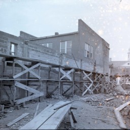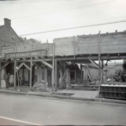 Photograph of a group of men working with a railroad crane to install of piece of the railroad trestle crossing Toms Brook in the Town of Toms Brook Virginia.