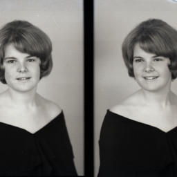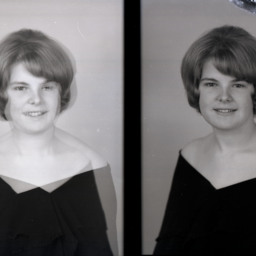 Photo of two separate portrait photographs of Karen Elaine (Hoover) Cook as a young woman with short hair and bangs.