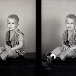 Photo of two separate photographs of Chris Cook as a young boy wearing a print shirt.