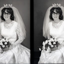 Photo of two separate photographs of Judy Ann (Hodson) Cook as a young bride wearing her wedding gown and veil. She is holding a wedding bouquet.