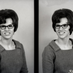 Photo of two separate portrait photographs of Gloria (Cook) Markley with short hair and glasses.