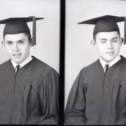 In this photograph, he is wearing his graduation cap and gown.