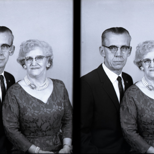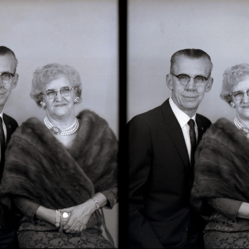 The man is wearing a suit and tie. The woman is wearing earrings, faux pearls, and a fur stole. Both are wearing glasses.
