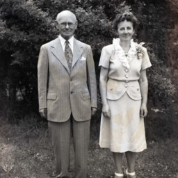 Unidentified older man with glasses and wearing a suit and tie is standing outdoors beside an unidentified woman with a corsage on her dress.