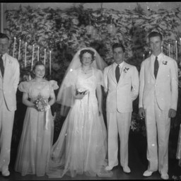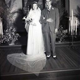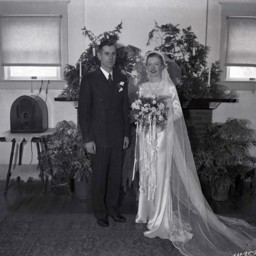 Photograph of an unidentified bride in her wedding gown and veil, standing beside her unidentified groom.