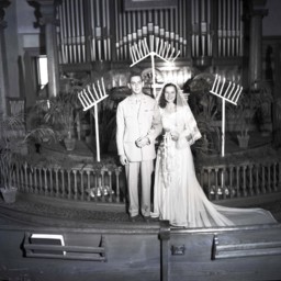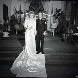 Photograph of an unidentified bride in her wedding gown and veil, standing beside her unidentified groom, who is wearing a U.S. Army uniform. They are on the left side of the image.