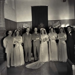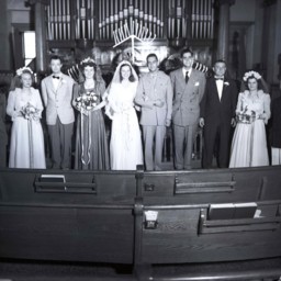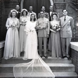 Photograph of Eugene and Rebecca (Golladay) Gardner as a young bride and groom standing with their wedding party at Emanuel Lutheran Church in Woodstock.