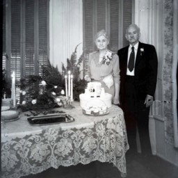 Photograph of Billy Hottle and Virginia Miller as a young groom and bride, standing together behind a multi-tiered cake with a wedding couple on top.