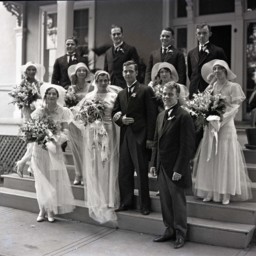 Unidentified bride and groom are pictured with their bridesmaid, best man, and several attendants.