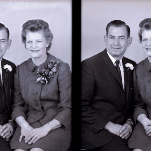 She is wearing a corsage. They are flanked by family or other members of their wedding…