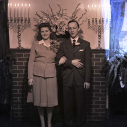 Unidentified man and woman are posed together in front of a brick fireplace with candelabras and a floral arrangement on the mantel.