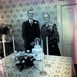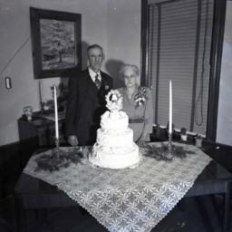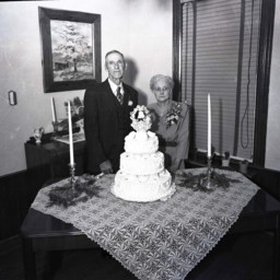 Photograph of Addison Lee Fogle and his wife, Minnie B. (Cook) Fogle standing together behind a large, multi-tiered cake.