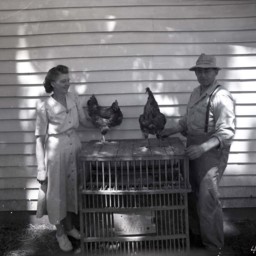 Unidentified man and woman, both with glasses, are standing outdoors and posed on either side of a cage on which stands two chickens.