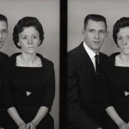 Photo of two separate portrait photographs of the same unidentified man and woman seated together.