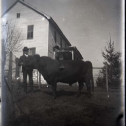 Unidentified man in a hat and suit is holding the halter of a cow. An unidentified child is sitting on the back of the cow. There is a house behind them.