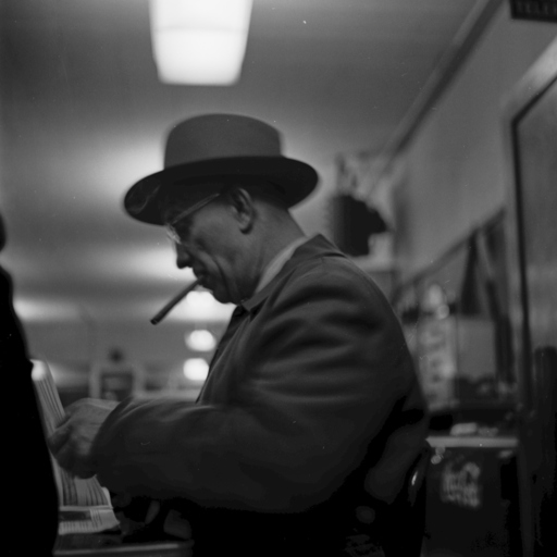 Candid photograph of Wilbur Craig at Walters Restaurant reading a newspaper taken in February 1956.