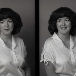 Photo of two separate portrait photographs of Pam Crouse as a young woman with short hair.