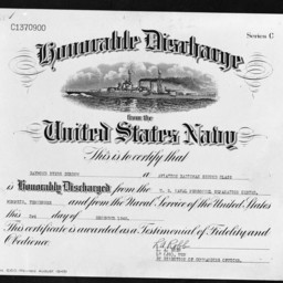 Photograph of the form titled, "Notice of the Separation From U.S. Naval Service" signed by Raymond B. Derrow, formerly of Harrisonburg, Rockingham County, Virginia, in 1945.