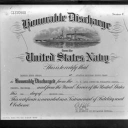 Photograph of the document certifying that Aviation Radioman Second Class Raymond Byers Derrow was honorably discharged from the Navy in Memphis, Tennessee, on December 3, 1945.