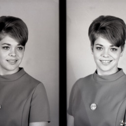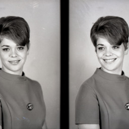 Photo of two separate portrait photographs of Sharon E. (Evans) Dinardo as a young woman with short hair.