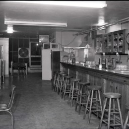 A lunch counter and bar stools can been seen. There are tables and booths on the left.
