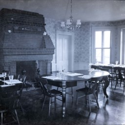 Tables are set for diners, a brick fireplace dominates one end of the wallpapered room, and tall windows on the right allow in ample natural light.