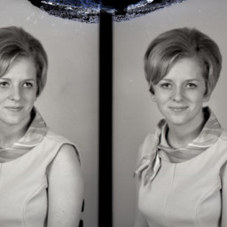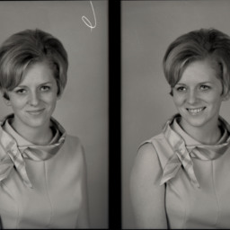 Photo of two separate portrait photographs of Diane (Foster) Dose as a young woman with short hair.
