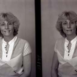 Photo of two separate portrait photographs of Georgiana Dubois with short hair.