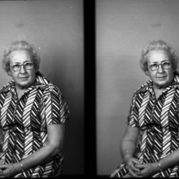 Photo of two photographs of Elizabeth (Thompson) Everly of Mt. Jackson, with glasses, and wearing a patterned, short-sleeved, dress.