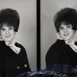 Photo of two separate portrait photographs of Peggy Evy as a young woman with short hair.