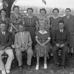 Unidentified older man and woman are seated, outdoors, with two young men posed on either side of them. An additional six unidentified women are standing behind the group.