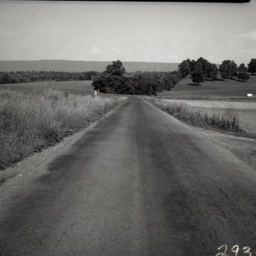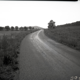 Scenic view along a country road in Shenandoah County, Virginia. Fields and a hill are visible in the background.