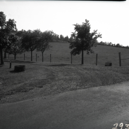 Photograph of a gravel driveway lined with trees. A fenced pasture is visible on one side.