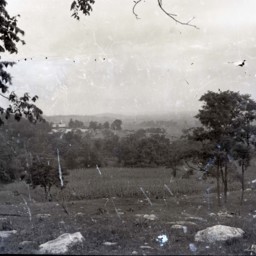 Damaged image of a view looking across a wide expanse of fields and trees in the Shenandoah Valley.