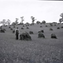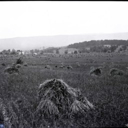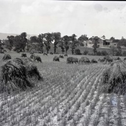View across a wheat field that has been cut and put in piles awaiting further processing.