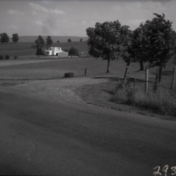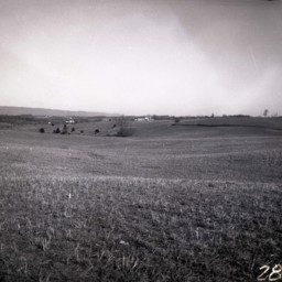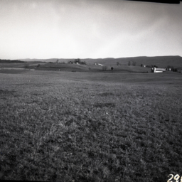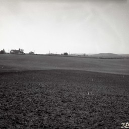 View looking across rolling fields. Farms and outbuildings are visible in the distance.