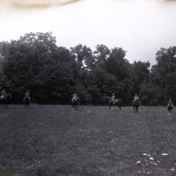 Six unidentified boys on horseback with an adult male also on a horse on the far left.