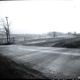 Photograph of an unidentified paved road as it crosses railroad tracks.