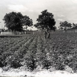 Photograph of an unidentified farmer wearing overalls and a hat is standing beside an unidentified boy in a large field planted in a knee-high, flowering crop.