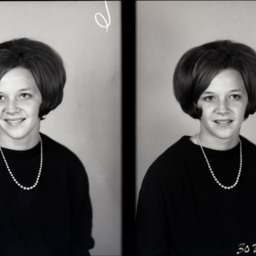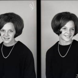 Photo of two separate portrait photographs of Karen Fleming as a young woman wearing faux pearls and short hair.