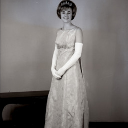 Phyllis (Hottle) Fleming as a young woman wearing a formal gown with long gloves and a tiara in her hair.