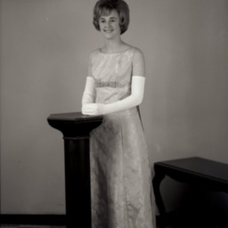 Phyllis (Hottle) Fleming as a young woman standing by a studio column prop and wearing a formal gown with long gloves.
