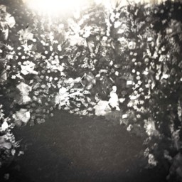 Photograph of a bed of blooming tulips belonging to Grace Elma Johnson Morrison. The blooms are below a covered porch. A cracked sidewalk is visible in front of the flowers.